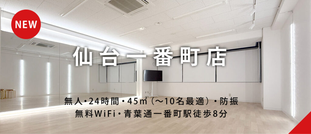 ダンス練習/撮影・スチール撮影・記念写真・ヨガ・自主トレーニング・フラメンコ練習(山形七日町店のみ)・バレエ練習・YouTube撮影・ストレッチ・研修・エクササイズ・ポールダンス(山形七日町店のみ)・コスプレ撮影・ライブ配信・収録・ポートレート・フィットネス・文化祭練習・格闘技・楽器演奏(山形七日町店のみ)・発声練習(山形七日町店のみ)・web面談・面接・オーディション・出張マッサージ・DVD鑑賞・ゲーム・日本舞踊・ポージング練習